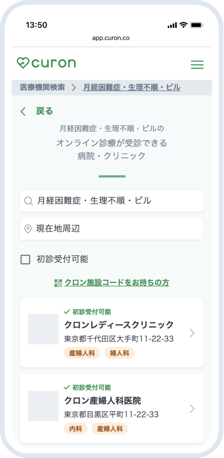 クロンを導入いただいている医療機関でのみ受診することができます。クロンを導入している医療機関一覧は、こちらから検索いただくことができます。